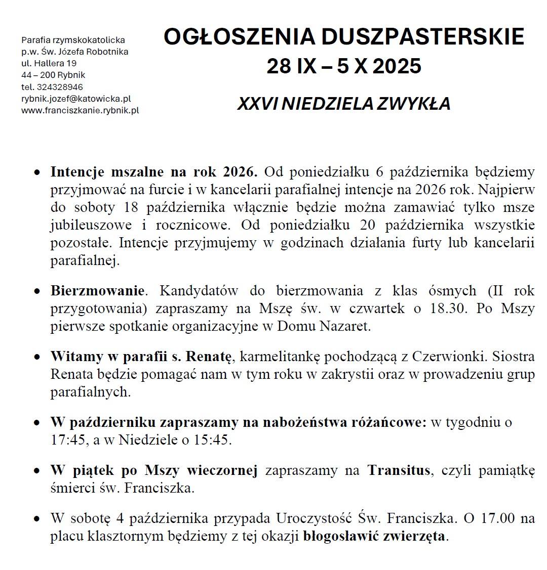 Co niedziela, na koniec mszy, podawane są informacje o kościelnych wydarzeniach rozpoczynającego się tygodnia. Najczęściej określa się je mianem "ogłoszenia parafialne". Prezentujemy ogłoszenia z wszystkich lat (z małym wyjątkiem) naszej obecności w Rybniku.